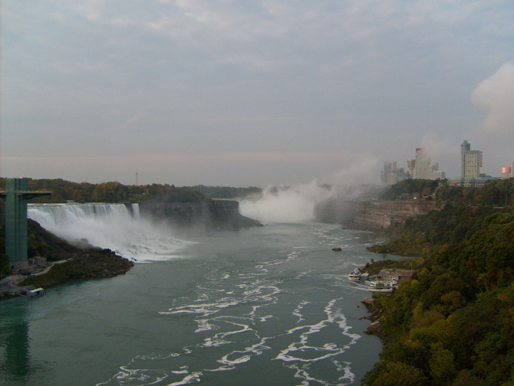 - en-CA Weather conditions in Niagara Falls when the photo was taken: Wind: east, 17 km Temp: 9° C Overcast Time: 8:19 a.m. This photo from Rainbow bridge, where concrete meets steel part of bridge.