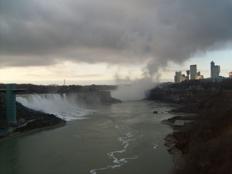 - en-CA Weather conditions in Niagara Falls when the photo was taken: Wind: east, 7 km Temp: -2° C Scattered clouds Time: 8:40 a.m. This photo from Rainbow bridge, where concrete meets steel part of bridge.