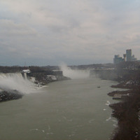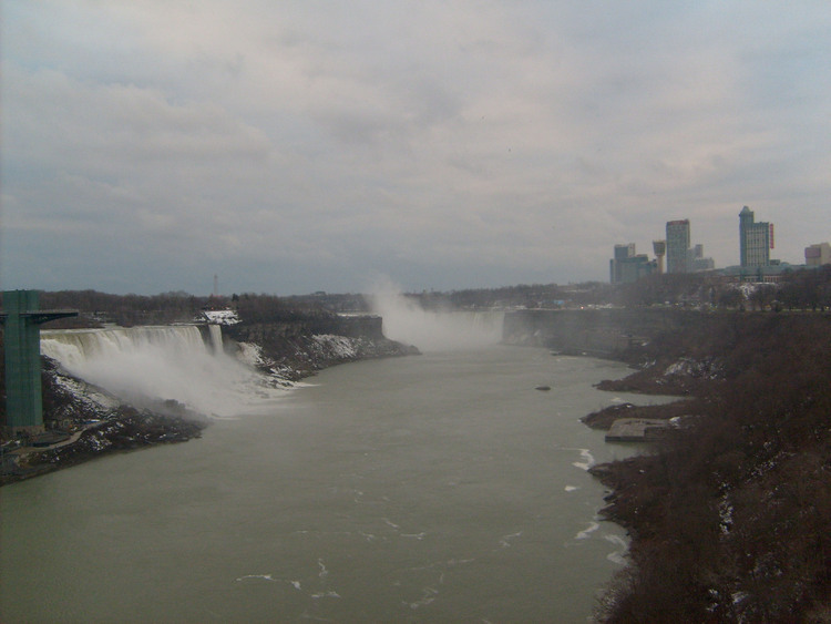 - en-CA Weather conditions in Niagara Falls when the photo was taken: Wind: west southwest, 30 km Temp: 3° C Overcast Time: 8:37 a.m. This photo from Rainbow bridge, where concrete meets steel part of bridge.
