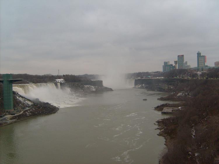 - en-CA Weather conditions in Niagara Falls when the photo was taken: Wind: calm Temp: -1° C Overcast Time: 8:25 a.m. This photo from Rainbow bridge, where concrete meets steel part of bridge.