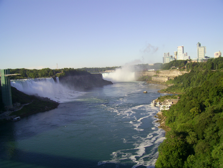 - en-CA Weather conditions in Niagara Falls when the photo was taken: Wind: east, 6 km Temp: 17° C Scattered clouds Time: 8:02 a.m. This photo from Rainbow bridge, where concrete meets steel part of bridge.