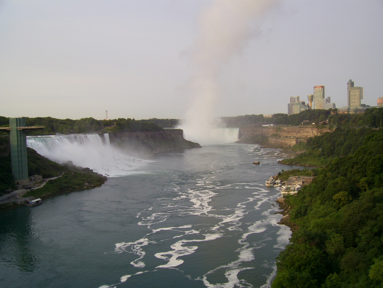 - en-CA Weather conditions in Niagara Falls when the photo was taken: Wind: southwest, 6 km Temp: 16° C Cloudy Time: 8:11 a.m. This photo from Rainbow bridge, where concrete meets steel part of bridge.