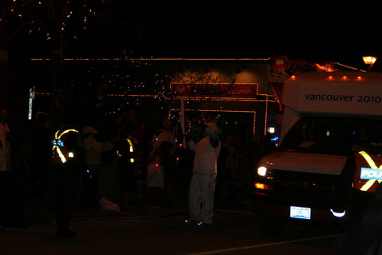 2010 Olympic Torch Relay in Niagara Falls - Torchbearer Beside Support Van in Front of That's Amore Pizzeria
