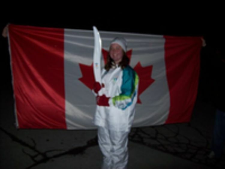 - 2010 Olympic Torch Relay in Niagara Falls - Hannah Termaat, Torchbearer 201 Holding Torch Aloft in Front of the Canadian Flag