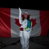 2010 Olympic Torch Relay in Niagara Falls - Hannah Termaat, Torchbearer 201 Holding Torch Aloft in Front of the Canadian Flag