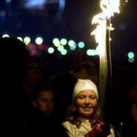 - 2010 Olympic Torch Relay in Niagara Falls - Hannah Termaat, Torchbearer 201 Holding Torch Aloft - Ferris Wheel in Background