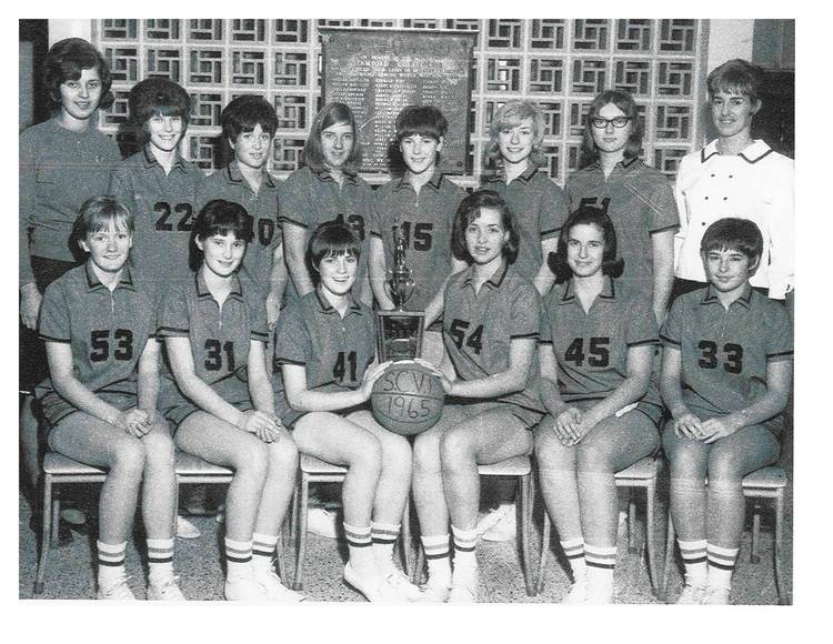 - Left to Right: Back row: Mira Pejnovic (Manager), Shirley Cook, Hilda Heximer, Helen Henderson, Judy Lewis, Betty Johnston, Sally Yarr, Miss Saunders (Coach) Front row: Marsha Booth, Anne Gibbs, Sue MacRae (Co-Captain), Judy Waterhouse (Co-Captain), Cindy Gold, Tella Sametz