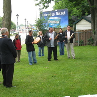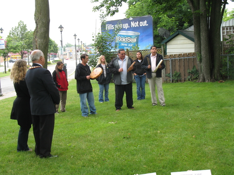 Urban Community Gardens Groundbreaking Ceremony - Mayor Ted Salci & Kassandra Murrary watching Ohnia:kara Native Drum & Dance Group