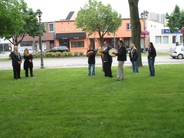 Urban Community Gardens Groundbreaking Ceremony - Mayor Ted Salci & Kassandra Murrary watching Ohnia:kara Native Drum & Dance Group - Euro Café in background