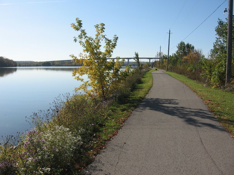 - en-CA The Welland Canal Trail in St. Catharines between locks two and three looking south with the Garden City Skyway in the background