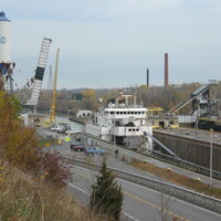 - en-CA A ship in the Welland Canal at Lock Four with the rail bridge lifted, as seen from the Welland Canal Trail with the General Motors plant in the background