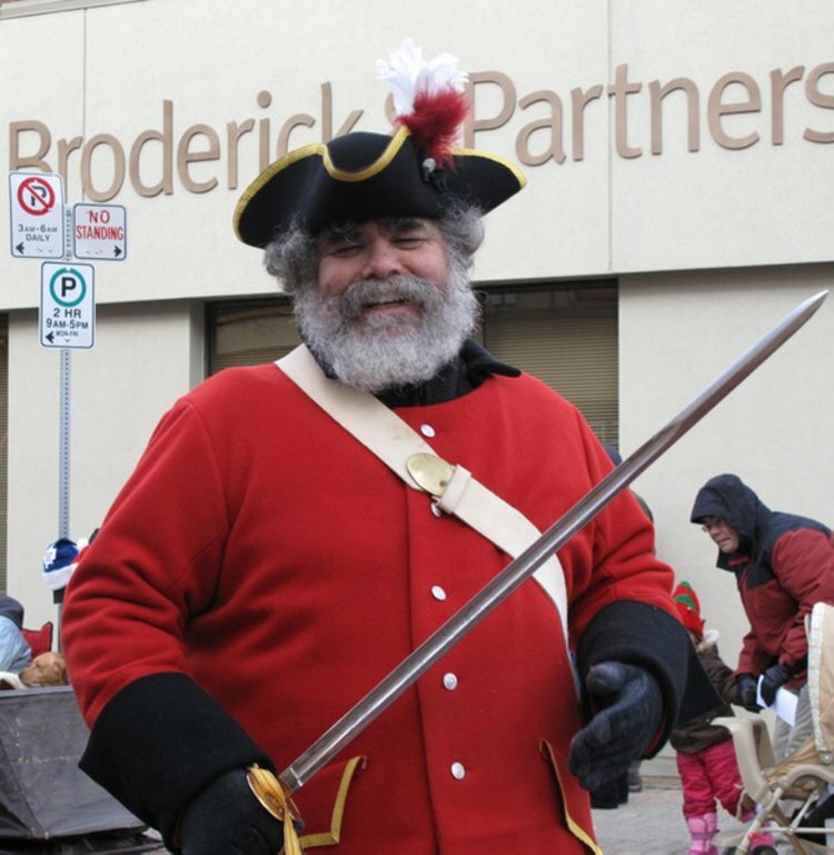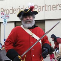 - Andrew Porteus Manager of Reference and Information Services Niagara Falls Public Library; in the costume of a Chelsea Pensioner, c1812 ; posing in front of the law offices of Broderick and Partners at the corner of Ontario Avenue and Queen Street downtown Niagara Falls ;