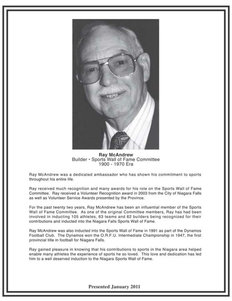 - en-CA Inducted into the City of Niagara Falls Sports Wall of Fame January 2011 ; Builder - Sports Wall of Fame Committee 1900 - 1970 Era ;