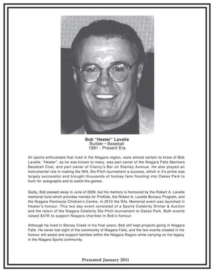 - en-CA Inducted into the City of Niagara Falls Sports Wall of Fame January 2011 ; Builder Baseball 1991 - present era ;