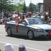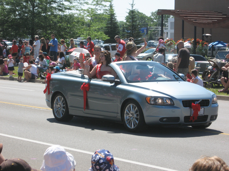 - Building in background (right) patio of Boston Pizza ; in foreground a silver grey Volvo C70 convertible carrying the three beauty queens ; Teen Miss Canada wearing red sash centre ;
