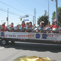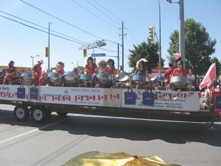 - Large float with a Steel Band on board crossing the intersection of Morrison and Dorchester ; advertising on side of float for ? Autos ; Crescent Air of St Catharines ; Sam's Geneva Street Pharmacy of St Catharines ;