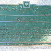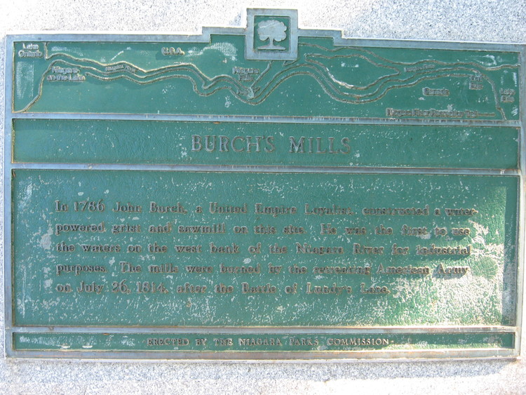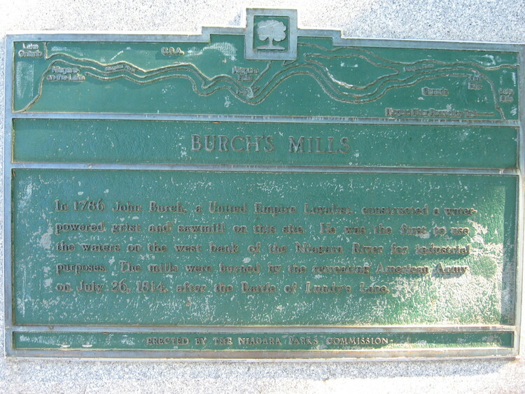 - en-CA Close up of Burch's Mill plaque located near the scow. Plaque reads: "In 1786 John Burch, a United Empire Loyalist, constructed a water-powered grist and sawmill on this site. He was the first to use the waters on the west bank of the Niagara River for industrial purposes. The mills were burned by the retreating American army on July 26, 1814 after the battle of Lundy's Lane".