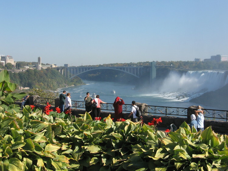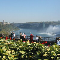 - en-CA Tourists viewing the American Falls with the Maid of the Mist boat and Rainbow bridge in the background.