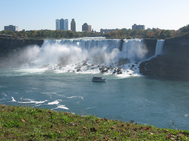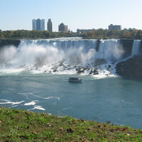 - en-CA The American Falls with the Maid of the Mist boat and Niagara Falls, New York skyline in the background.