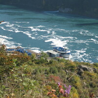 - en-CA Tourists on board the Maid of the Mist and those lined up at the landing waiting to board the boat.