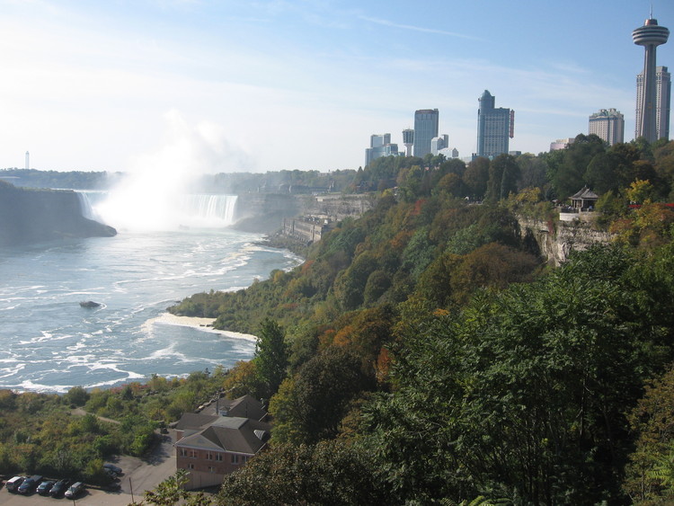- en-CA Fall colours at the Horseshoe Falls and lower Niagara River, with hotels and Old Ontario Power Generating Station to the right.
