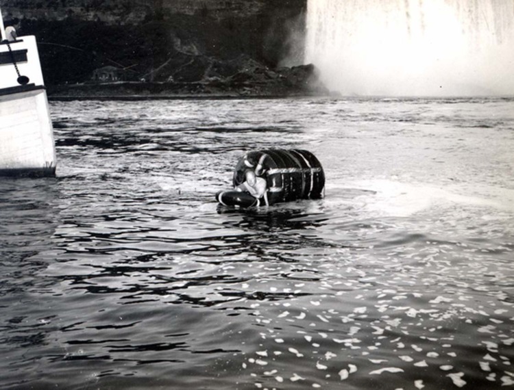 - en-CA William "Red" Hill Junior in the "Thing" in the lower Niagara River with the Falls in the background. He would die on August 5, 1951 after going over the Horseshoe Falls in it.