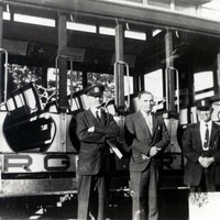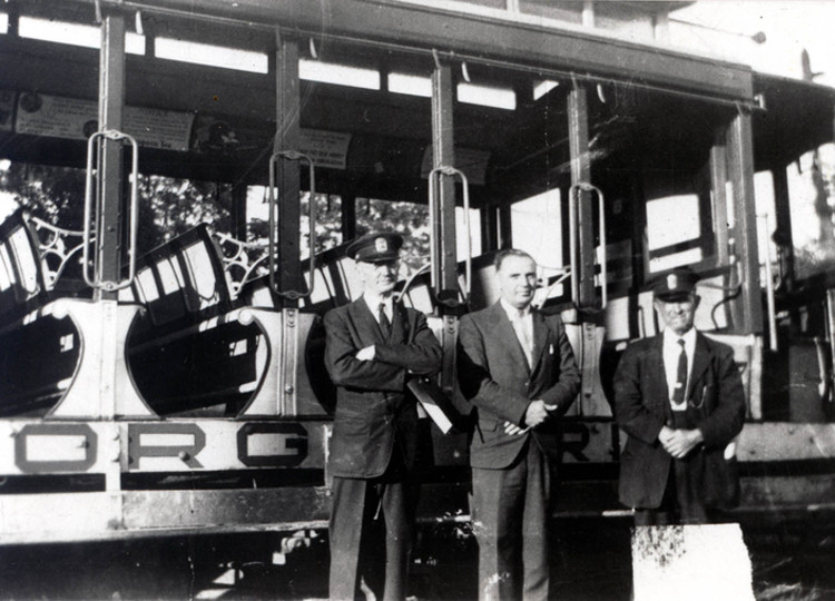 - en-CA Niagara Gorge street car with two conductors and one man in a suit standing in front of it.