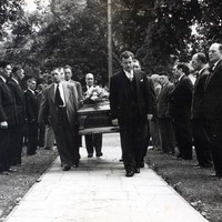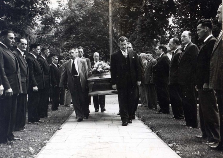 - en-CA William "Red" Hill Junior's funeral after his death on August 5, 1951. Fourth mourner on the right is Norman Chandler who built the "thing" in which Red died.