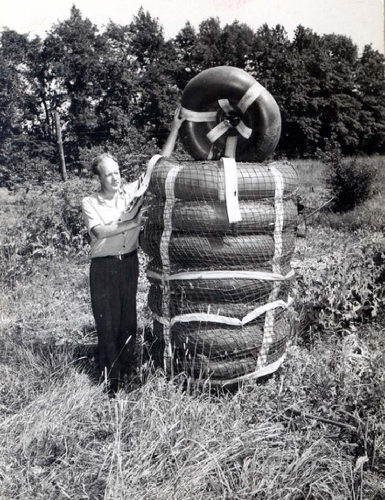 William "Red" Hill Junior Standing by the "Thing" in which he died after going over the Horseshoe Falls on August 5, 1951