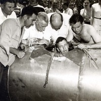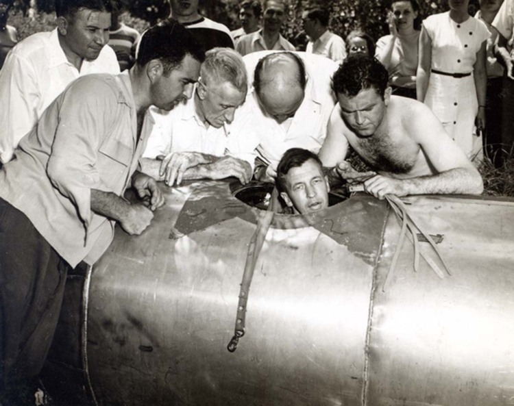 - en-CA Major Llyoyd Hill sitting in William "Red" Hill Senior's steel barrel.