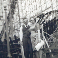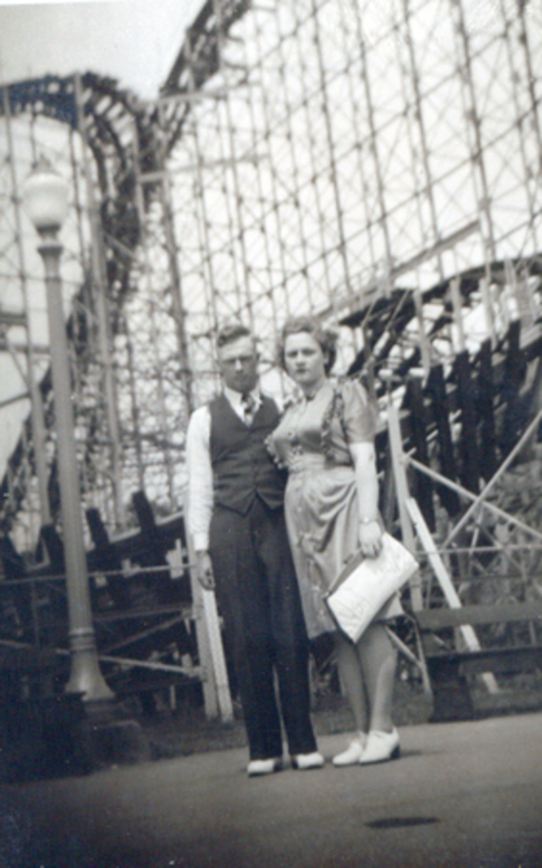 - L-R: Webb Dunlop, June Dunlop; both are standing in front of the giant roller coaster located at the amusement park ;