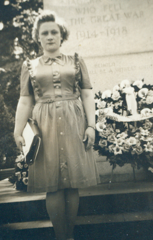 - June Dunlop is standing in front of the cenotaph located at the bottom of Clifton Hill