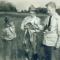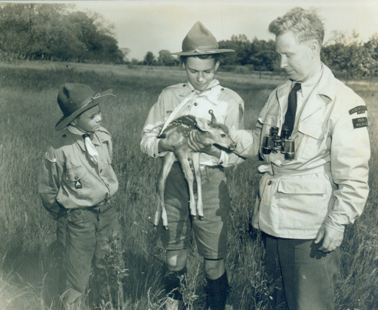 - Conservation Officer A Roy Muma of the Ontario Department of Lands and Forests & Fish & Wildlife Niagara area showing a young deer to boy scouts