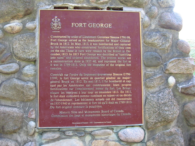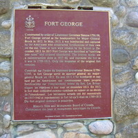 - en-CA Plaque at Fort George: "Fort George. Constructed by Lieutenant Govenor Simcoe 1796-99, Fort George served as headquarters for Major-General Brock in 1812. In May 1813 it was bombarded and captured by the Americans who constructed fortifications of their own on the site. These in turn were retaken by the British in December 1813. In 1815 Fort George was described as 'tumbling into ruins' and ordered abandoned. The present works are a reconstruction done in 1937-40, and represent this fort as it was in 1799-1813. Only the magazine of the original fort remains."