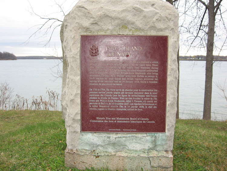 - en-CA Navy Island plaque: The British used navy Island from 1761 to 1764 as a shipyard in which to build the first British decked vessels to sail the upper lakes. These were essential in maintaining the supply lines westward during Pontiac's uprising, 1763-4. Thereafter the island remained undisturbed until 14 December 1837 when WilliamLyon Mackenzie, after being defeated in Toronto, led a "Patriot" army from Buffalo to occupy it. Swift reaction by local militia and British regulars prevented his moving to the mainland, and on 14 January 1838, facing a hopeless situation, he abandoned the island.