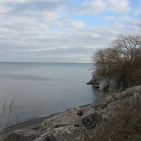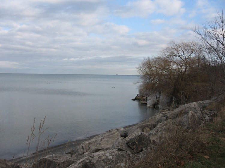 - en-CA Icy tree branches at Lake Ontario near Geneva Street, seen from the Waterfront Trail. A lake ship is in the background near the Welland canal entrance.