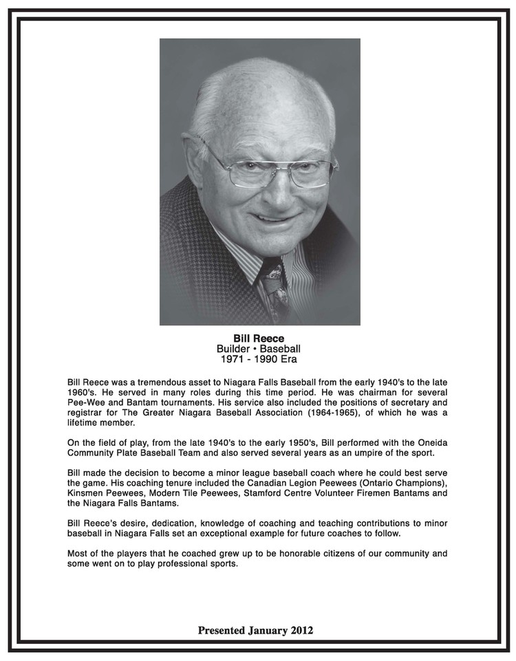 - en-CA Inducted into the City of Niagara Falls Sports Wall of Fame January 2012 ; Builder - Baseball 1971 -1990 Era ;