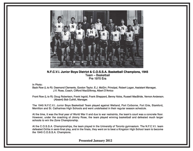 - N.F.C.V.I. Junior Boys District & C.O.S.S.A. Basketball Champions, 1945