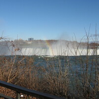 - en-CA Rainbow at the brink of the Horseshoe Falls with Niagara Falls, New York in the background.
