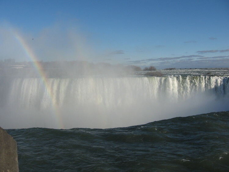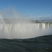 - en-CA Rainbow at the Horseshoe Falls with control gates in background.