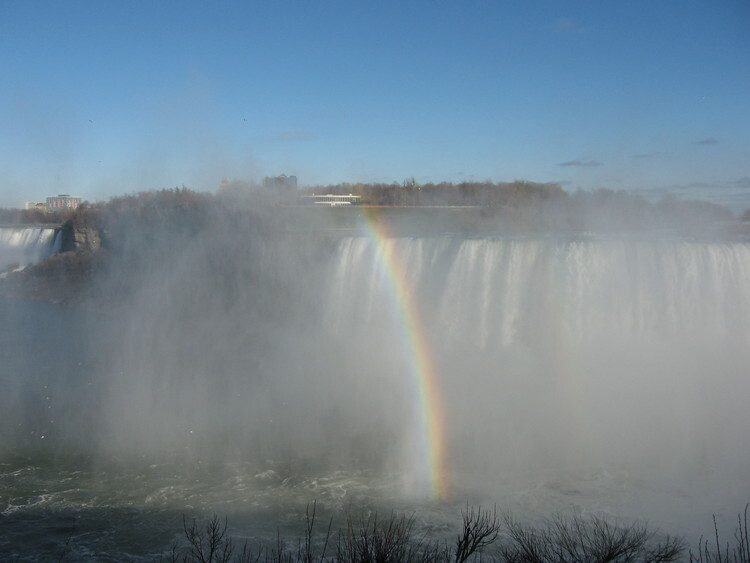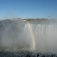 - en-CA Rainbow at the Horseshoe Falls with Niagara Falls, New York in the background.