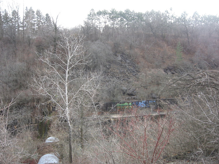 - en-CA Graffiti along the hydro canal between Morrison and Thorold Stone Road, as seen from the Millennium Recreational Trail, Paisley Janvary-Pool Pathway.