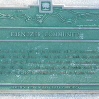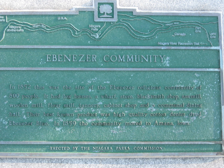 - en-CA Plaque reads: In 1852 this was the site of the Ebenezer religious community of 800 people. It had log houses, a wharf, store, blacksmith shop, sawmill, woolen mill, four mill, tannery, cabinet shop and a communal dining hall. Their best known product was high quality cotton denim dyed Ebenezer Blue. In 1859 the community moved to Amana, Iowa.