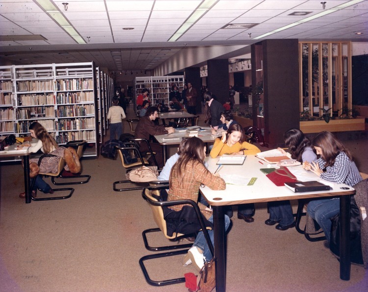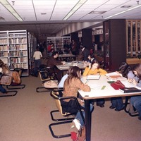 - en-CA Interior picture of the non-fiction area of the Niagara Falls Public Library on Victoria Avenue with patrons sitting at tables.