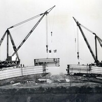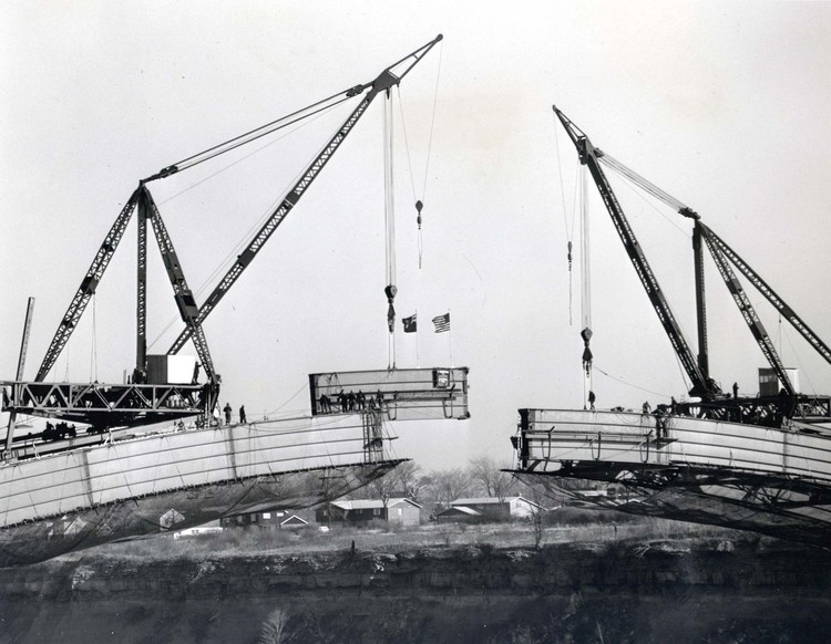 - en-CA Construction of the Queenston- Lewiston Arch Bridge. Centre span is being put in place.