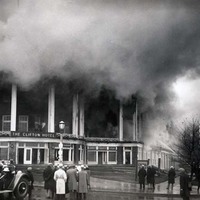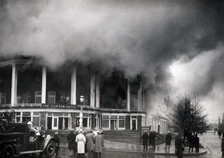 - en-CA Firefighters with hoses spraying water on the Clifton Hotel fire with bystanders looking on, December 31, 1932