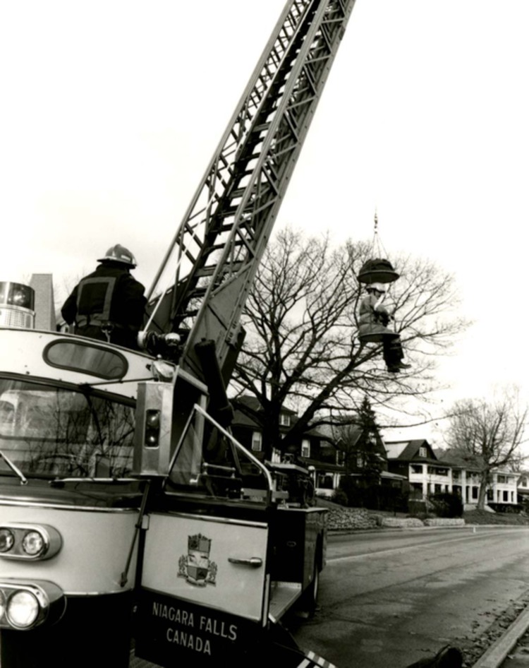 - en-CA Paul Hubbard, a Niagara Falls firefighter, suspended in a sling, about to be lowered over the edge of the Niagara Falls gorge on the Canadian side to take photographs of the Indian Cave