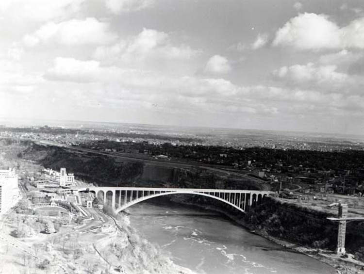 - en-CA Aerial view of the Lower Niagara River and Rainbow Bridge with Niagara Falls, New York in the background