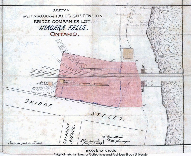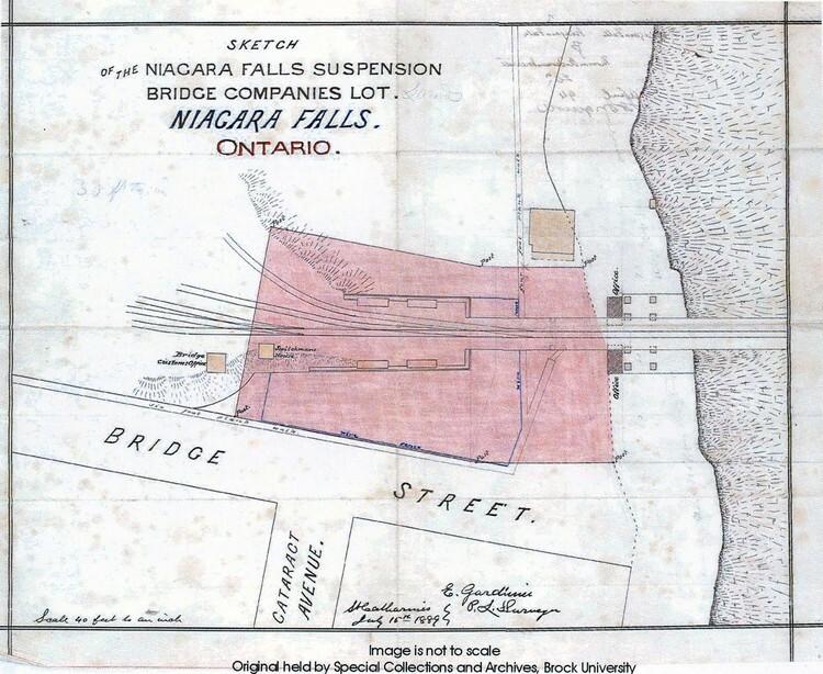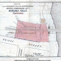 - en-CA Sketch of the Niagara Falls Suspension bridge Companies Lot, Niagara Falls, Ontario Image is not to scale: Scale 40 feet to an inch Original held by Special Collections and Archives, Brock University