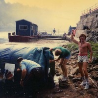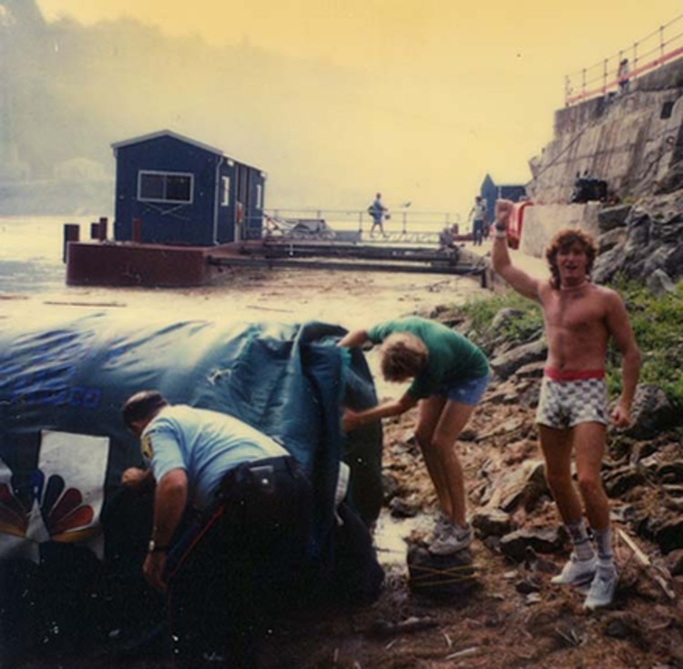 - en-CA Steve Trotter, a 22 year old part-time bartender from Barrington, Rhode Island went over the Horseshoe Falls on August 18, 1985. His device was made of 2 plastic pickle barrels surrounded by large innertubes and covered by taraplin. This photo shows Trotter and his device by the Maid of the Mist dock after his successful plunge.plunge. The Niagara Falls Review said "Trotter emerged from his home-made rubber barrel moments after making the 55 metre (180 feet drop) at 8:03 a.m.. Mr. Trotter was uninjured except for a small scratch on his right arm..."